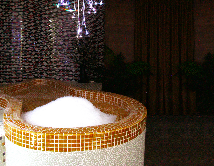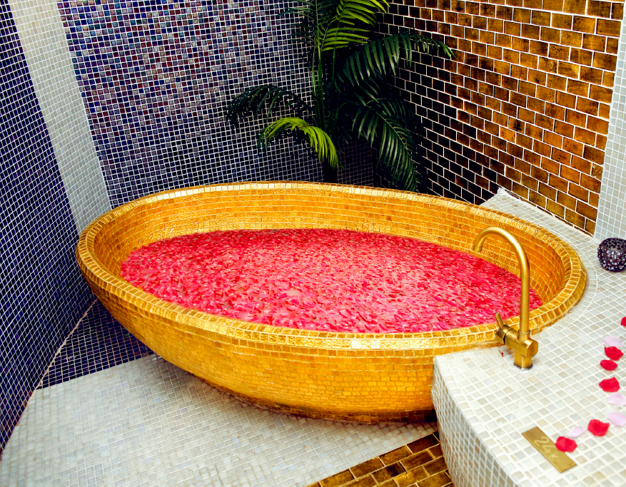 24 კარატიანი ოქროთი მოპირკეთებული აბაზანები თბება და ივსება რძის, ყვავილებისა და ღვინის ექსტრაქტით.